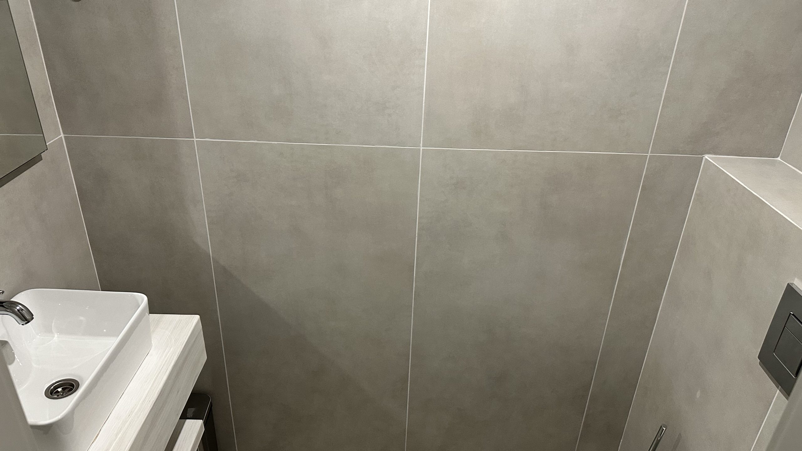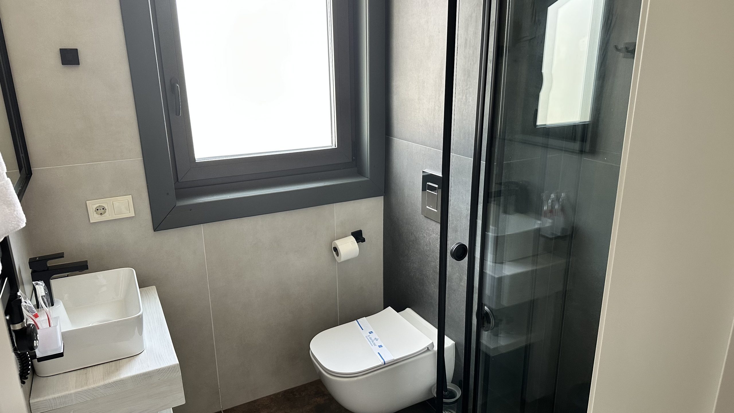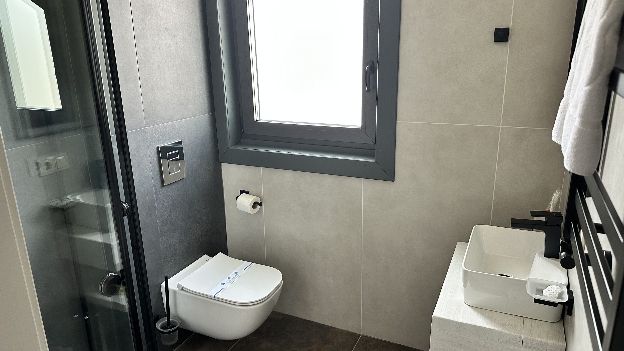 Сучасна ванна кімната обладнана душовою кабіною, умивальником, дзеркалом з підсвічуванням і феном.
