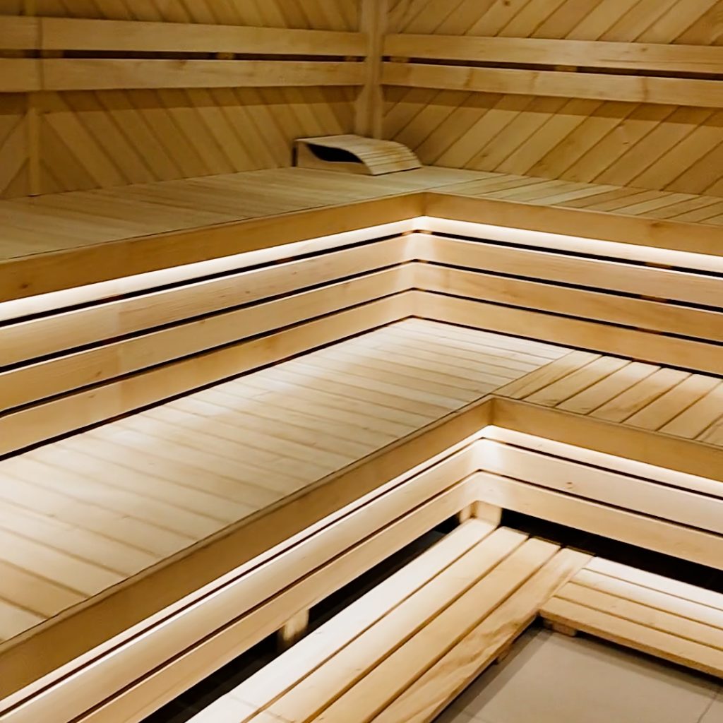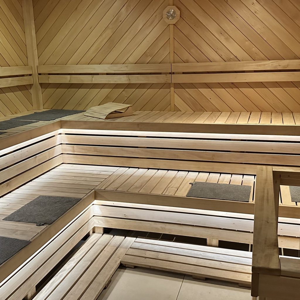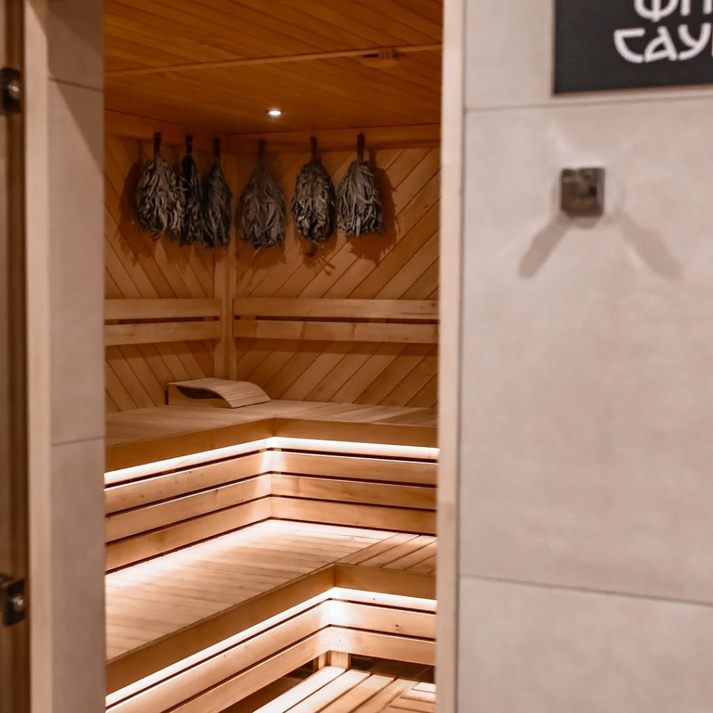 Інтер’єр фіто-сауни оформлений у природному стилі: дерев’яні поверхні, м’яке розсіяне світло,