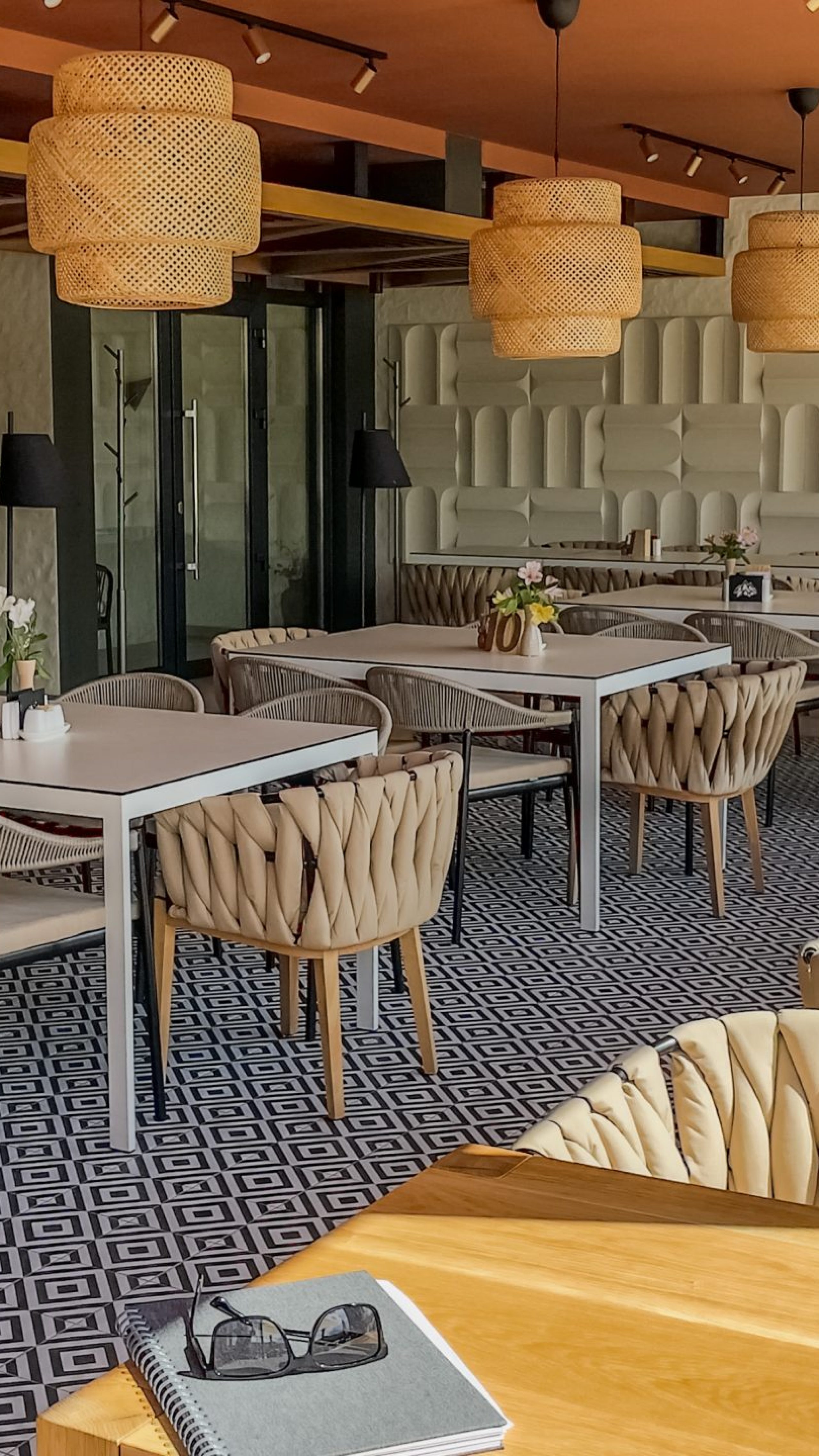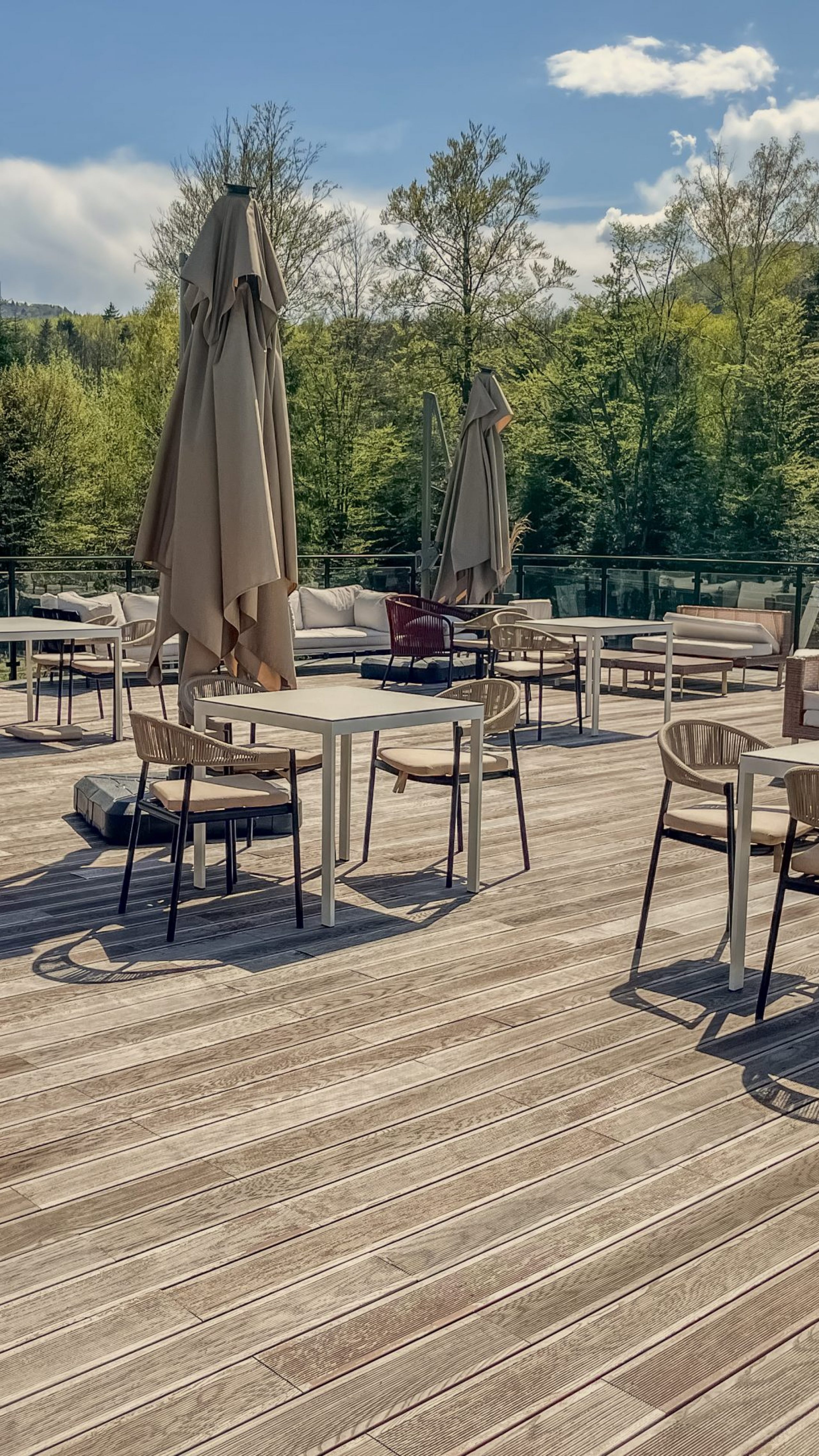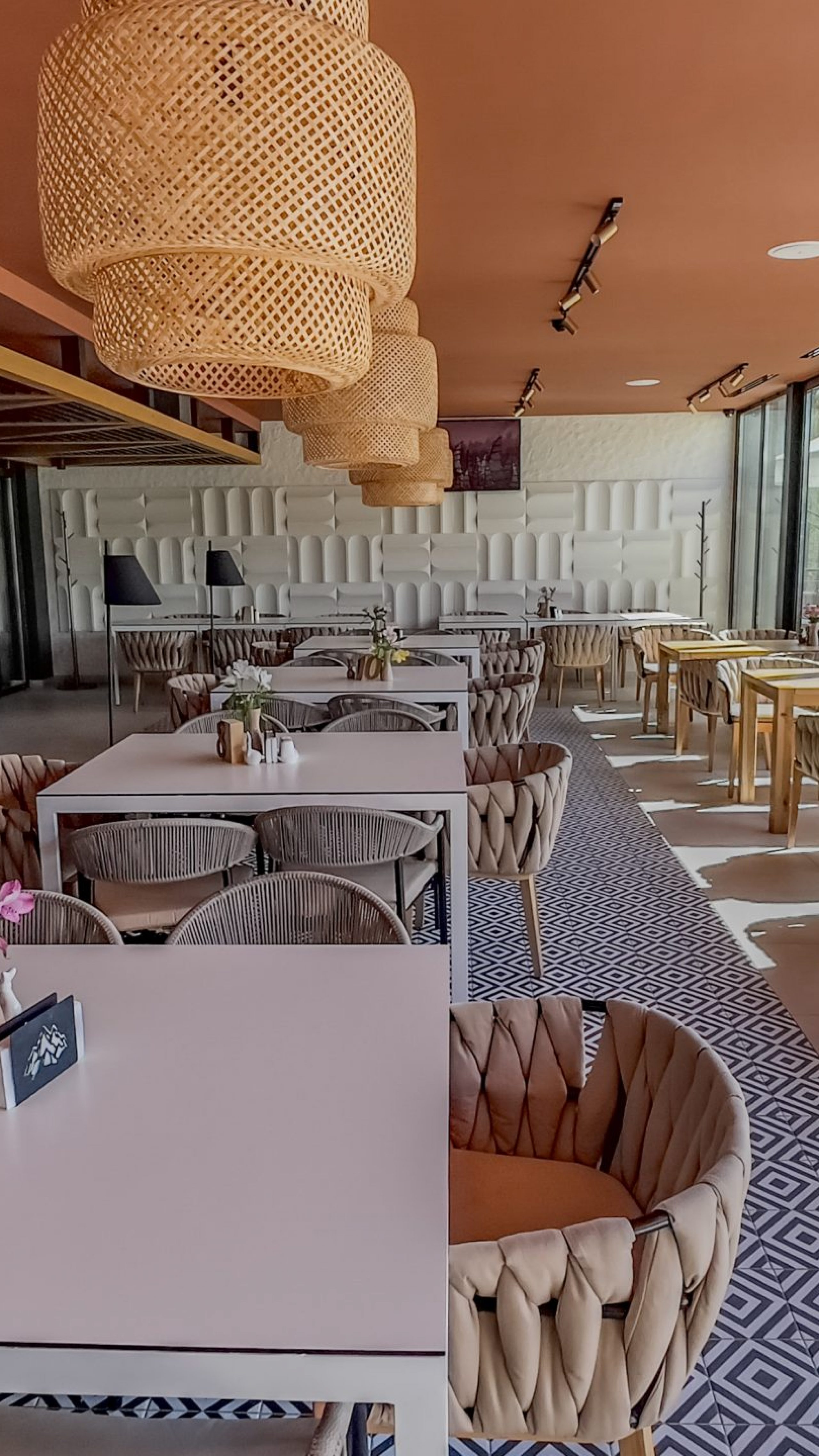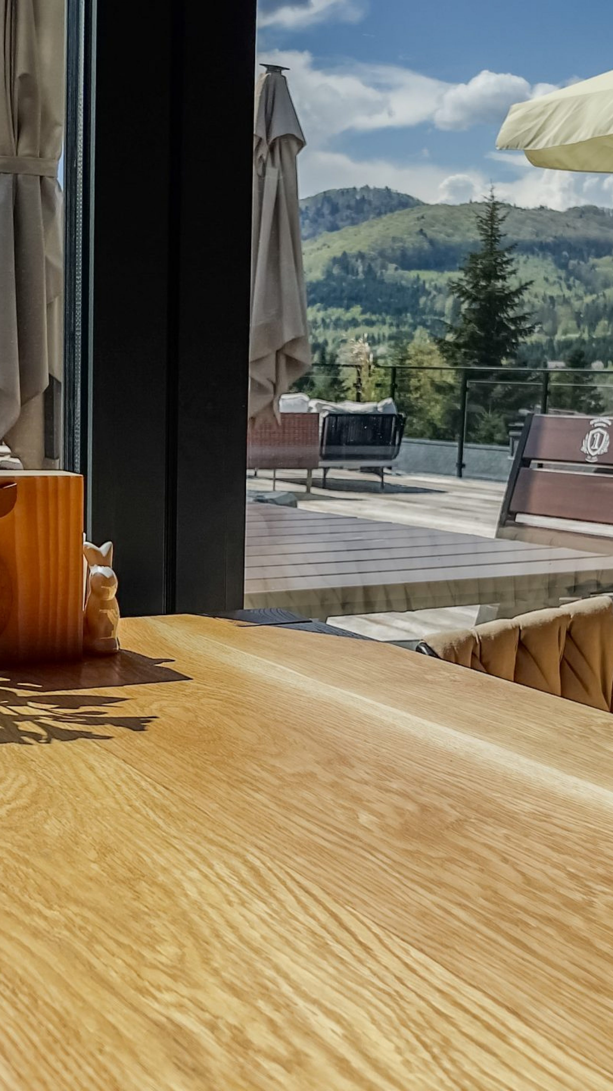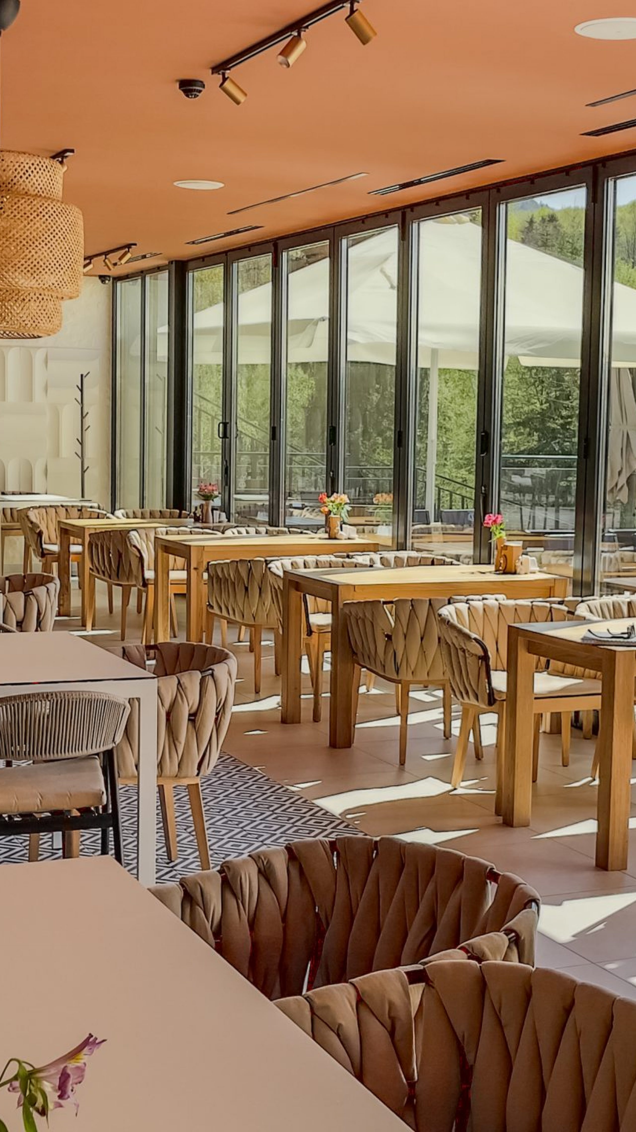 Інтер’єр ресторану гармонійно поєднує сучасний мінімалізм і натуральні матеріали: дерево, камінь, тепле освітлення. Все це створює атмосферу елегантності й затишку, яку доповнює чисте гірське повітря та види на Карпати.